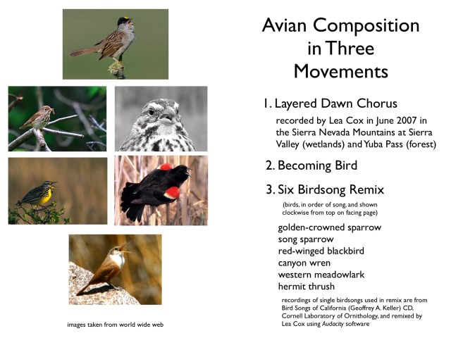 I recorded nature sounds up in various locations including Sierra Valley on the East side of the Sierra Nevada Mountains in California, and at Yuba Pass in the Sierra. I mixed the soundscapes from these two different ecosystems to make one composition, entitled “Layered Dawn Chorus”. Another composition began with a recording of myself saying “Becoming Bird”, then speeding up the tempo until it sounded like a bird. I then recorded 5 separate birdsongs, where I edited birdsongs from each of 5 different birds, creating 5 separate compositions, entitled “Six Birdsong Remix”.